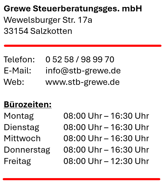 Das Steuerbüro befindet sich im Erdgeschoss des Bürogebäudes an der Wewelsburger Str. 17a in Salzkotten (Eingang rote Tür). Die Besucherparkplätze sind direkt vor dem Gebäude für Sie reserviert.